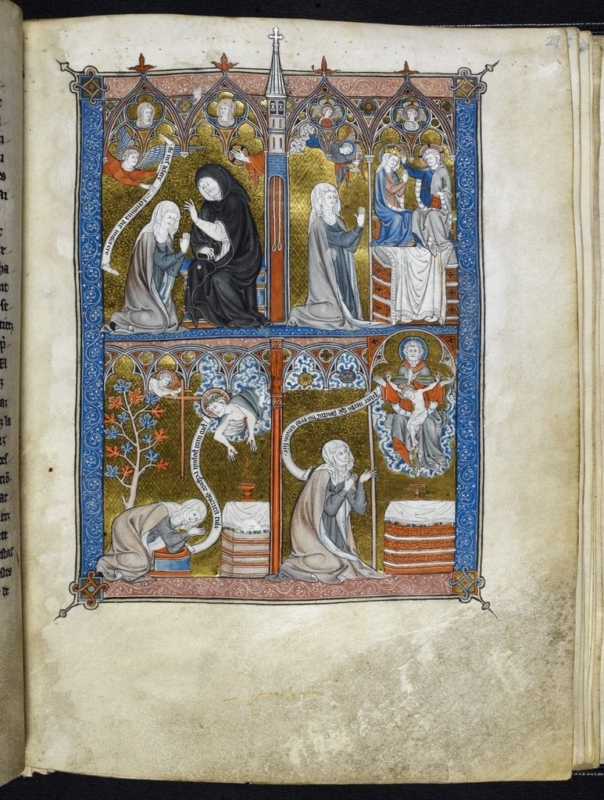 Коронацію Діви Марії, схожу на сцену з мініатюри, можна побачити на різьбленому вівтарному образі, виготовленому для головного вівтаря цистерціанського абатства Марієнштат. Цей поліптих, на верхньому рівні якого стоять трійки апостолів, а на нижньому розміщені бюсти-релікварії з мощами святих кельнських дів, — це своєрідне зображення небесного Єрусалима. За металевими решітками попереду й унизу теж зберігалися реліквії. Імовірно, крила поліптиха були переважно згорнуті — їх відкривали, щоби показати мощі, тільки в неділі й на великі свята. Завдяки цим постійним змінам досвід споглядання вівтаря разюче відрізнявся від того, який сьогодні пропонує музей, де все видиме, а тому перетворення неможливе. Церква мусила контролювати сприйняття реліквій, і вівтар у Марієнстаті був способом формувати це сприйняття через часткову демонстрацію і часткове приховування.